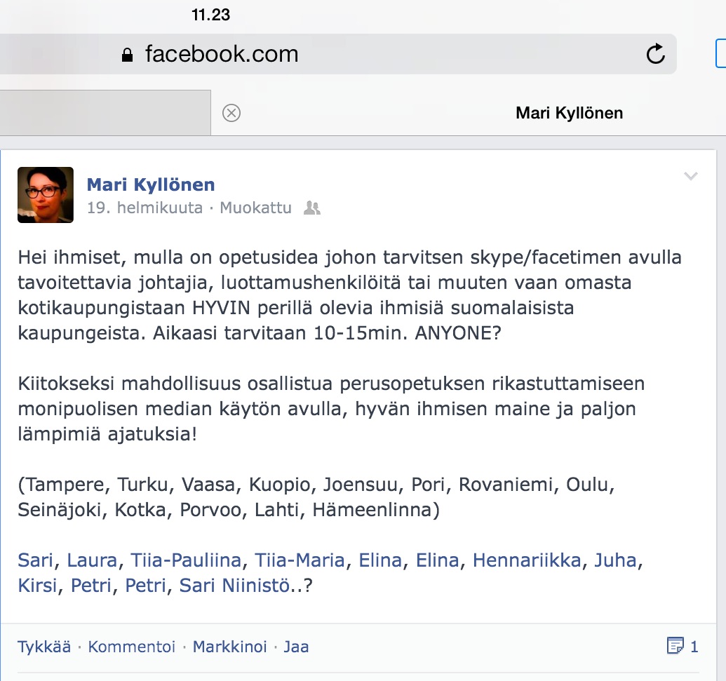 Videoviestintäpalvelut (esim. Skype, FaceTime) sopivat erinomaisesti oppimisen elävöittäjäksi. Esimerkkinä mm. kotimaan kaupunkeihin ja maisema-alueisiin liittyvät live-haastattelut Suomen maantieteen jaksolla. Haastateltavat löytyivät kätevästi sosiaalisen median (Facebook, LinkedIn, Twitter) avulla. Haastattelujen perusteella koottiin luokan yhteinen Suomen kartta kaupunkitietoineen ThingLink:iä hyväksi käyttäen.